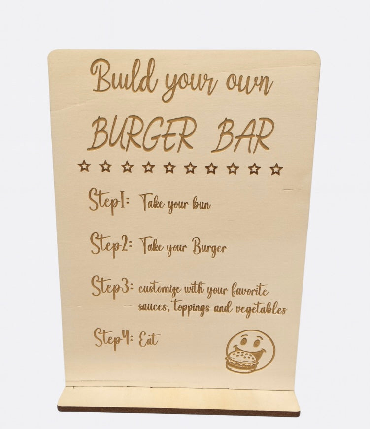 Decoratieve houten tafelstaander op voet met de tekst Burger Bar – Build your own burger. Ideaal om je buffet of foodcorner op feesten, barbecues en evenementen een originele en stijlvolle uitstraling te geven. Herbruikbaar, stevig en een echte blikvanger.