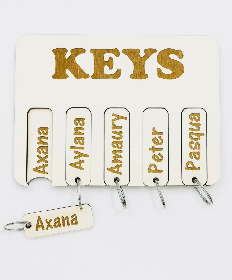 Deze houten sleutelhouder wordt op maat gemaakt voor jou gezin. Ieder familielid heeft zijn eigen gepersonaliseerde sleutelhanger met naam, die netjes terug te hangen is in de houder.