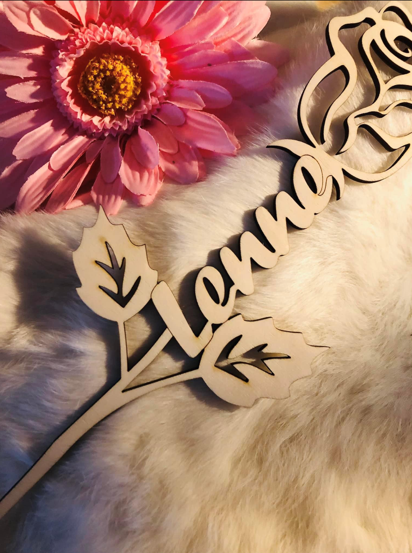 Deze elegante houten roos wordt gepersonaliseerd met jouw naam of die van een geliefde. Perfect als cadeau voor Moederdag, Valentijn, verjaardagen of als decoratie.